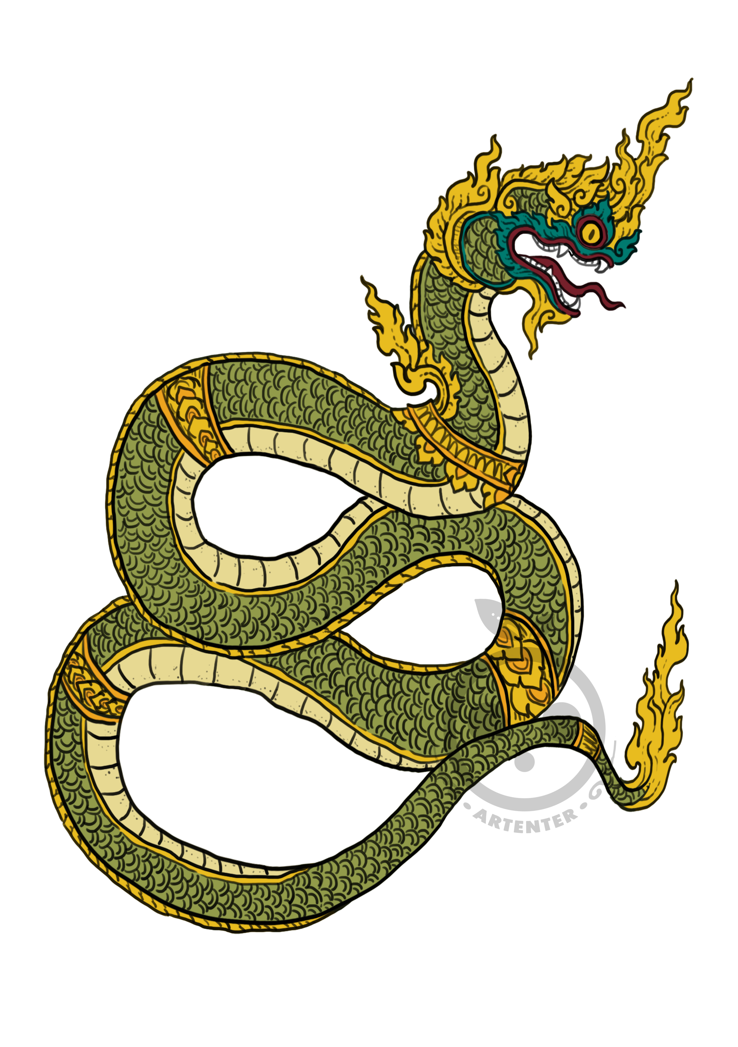 - นาค หรือพญานาค เป็นสัตว์ที่มีลักษณะรูปร่างเป็นงู ลำตัวยาว มีเคราและมีหงอน