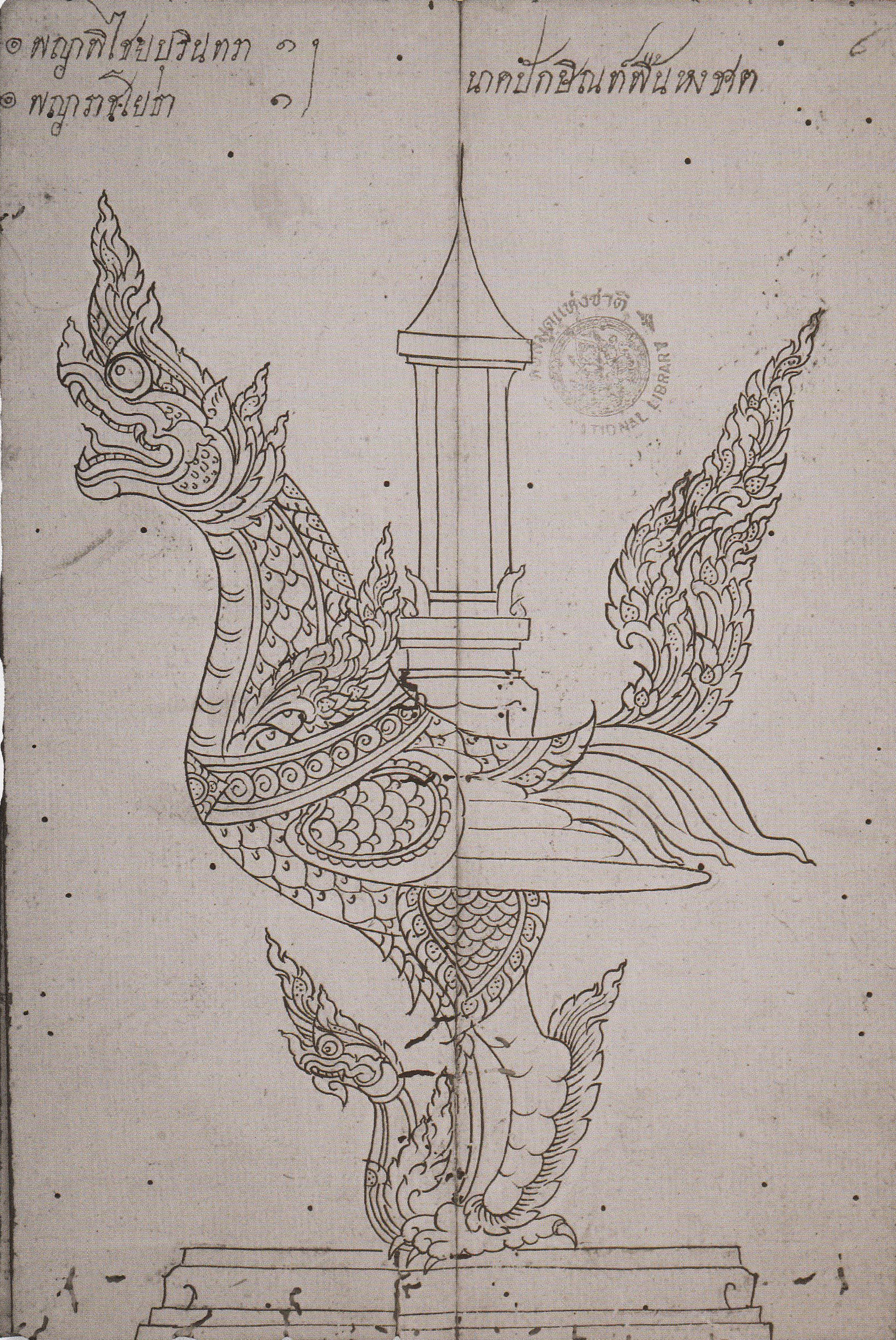 - นาคปักษิณ หรือนาคาปักษิณ เป็นสัตว์ที่มีลักษณะผสมระหว่างนกและนาค โดยมีส่วนหัวเป็นนาค ส่วนลำตัวเป็นนก หางเป็นแบบกระหนก ตัวสีหงชาด