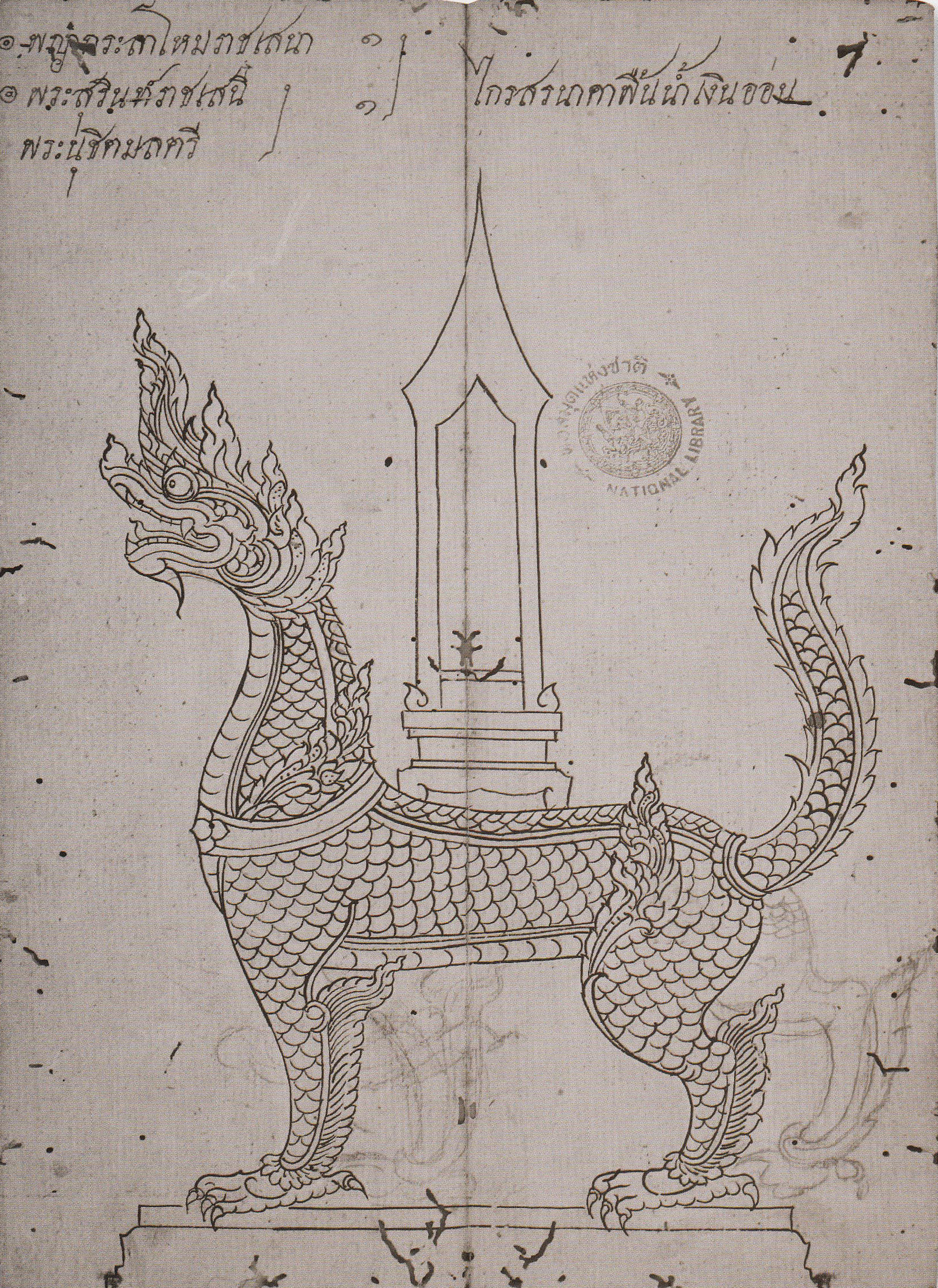 - ไกรสรนาคา เป็นสัตว์ที่มีลักษณะผสมระหว่างสิงห์และนาค มีส่วนหัวและหางแบบนาค มีส่วนลำตัวแบบสิงห์ ตามตัวมีเกล็ด ตัวสีน้ำเงินอ่อน