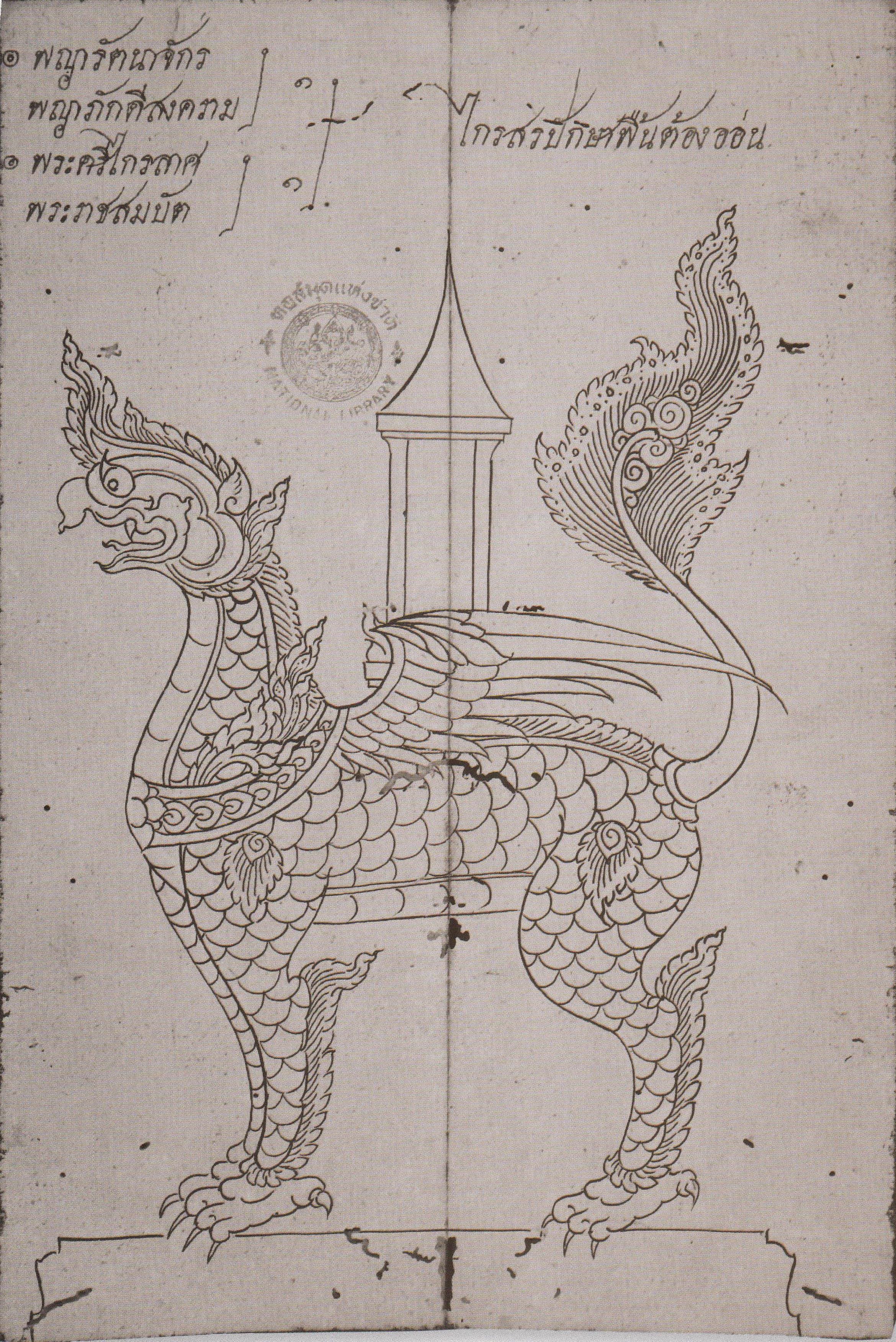 - ไกรสรปักษา เป็นสัตว์ที่มีลักษณะผสมระหว่างสิงห์และนก มีลำตัวแบบสิงห์ มีส่วนหัวแบบนกอินทรี มีหงอนตั้งไปข้างหน้า มีปีกกางขึ้น ตามตัวมีเกล็ด ตัวสีตองอ่อน